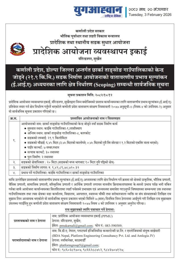 » कर्णाली प्रदेश, डोल्पा जिल्लाअन्तर्गत छार्का ताङसोंग गाउँपालिकाको केन्द्र जोड्ने सम्बन्धमा