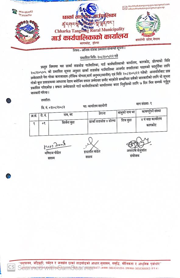 कार्यालय सहयोगी (का.स.) पदको अन्तिम नतिजा प्रकाशन सम्बन्धी सूचना।